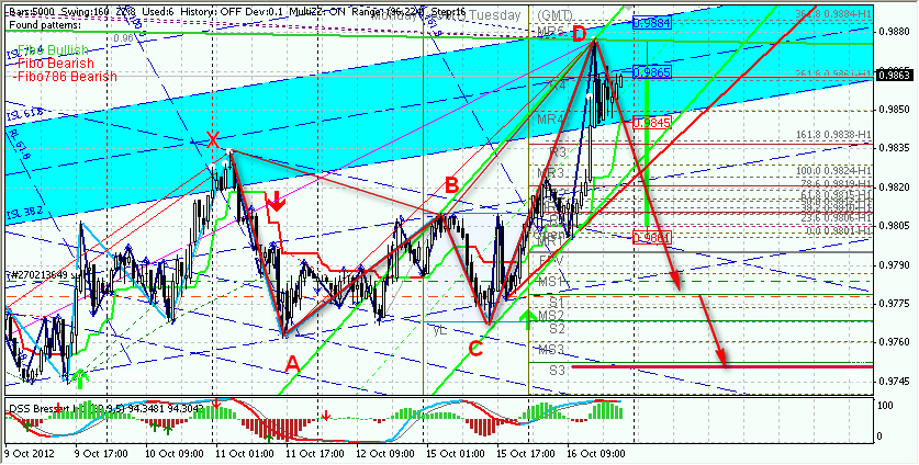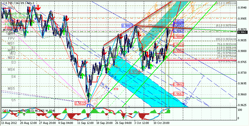 В общем... Закрыл я свою продажу и вот почему. Считаю, что цена отработала третью волну. Сейчас отрабатывается сходящийся треугольник. Выход из этого треугольника возможен импульсом вверх. Цель тогда получается на уровне фибо 461,8 (0,9907). Правда, есть один момент, который смущает. Это то, что цена ушла под восходящую трендовую. Т.е. покупка такая, несколько рисковая.