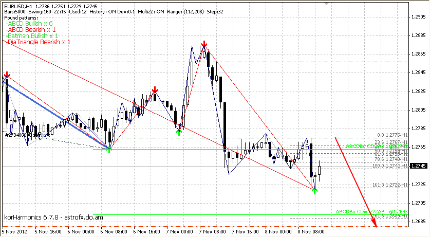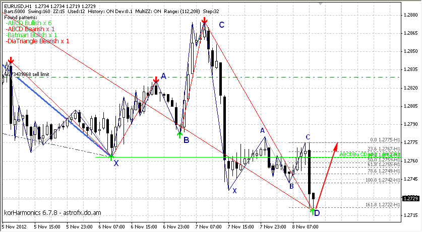 По поводу коррекции. Получили один в одном два гармонических бычьих паттерна. Про паттерн старшего порядка пока молчу, у него есть возможность еще растягиваться по крайней мере к уровню 1,2700. А целью отработки паттерна младшего порядка может быть сегодняшний хай на уровне 1,2775.