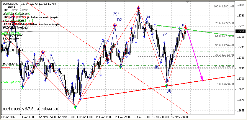 На часе у нас пока все в рамках приличия,пока ожидаю третью волну к 1.2690 и 1.2660.Но есть также небольшая вероятность отскока от уровня-1.2720.Склонен больше к тому,что пойдет третья волна .вниз в ценовую зону 1.2660-1.2690.А там уже нужно будет смотреть.