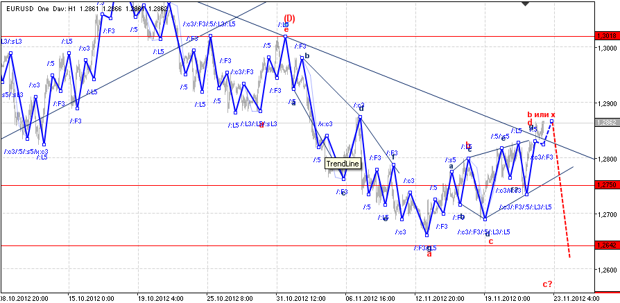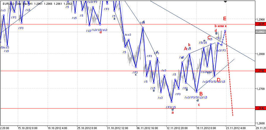 Несмотря на то, что локальный максимум был обновлен, изменять волновую разметку нет никаких существенных причин. Хотя внутренняя структура восходящего движения по своему виду стала слабо похожа на диаметрик и больше указывает на обратное чередование в Нейтральном Треугольнике, сущность остается прежней, в ближайшее время ожидаю завершение b-волны и возобновление нисходящего движения. Пробой уровня 1,2880 сделал невозможным развитие х-волны, тем самым подтверждая формирование b-волны.