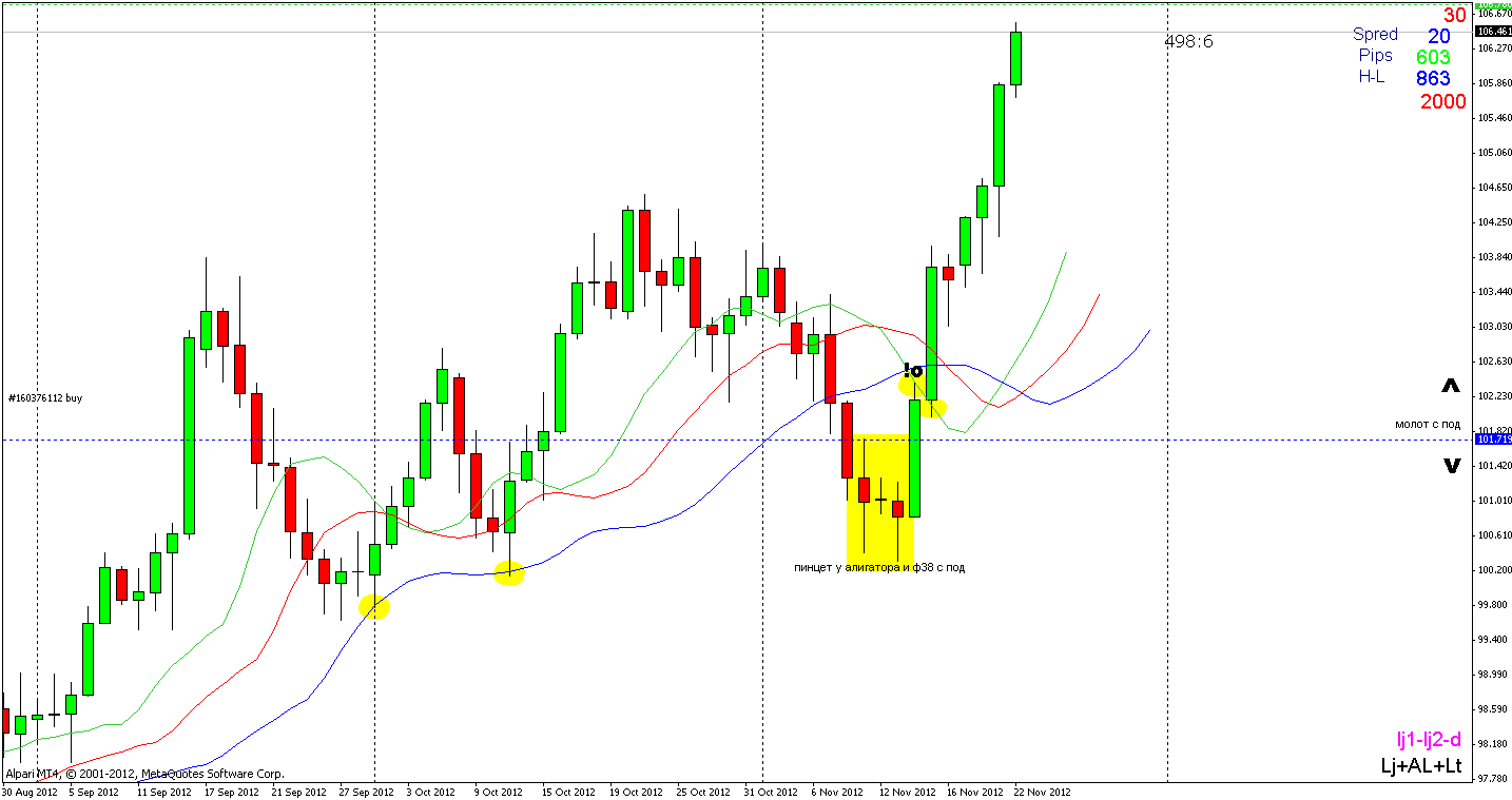После коррекции, и сформировав внизу пинцет, (другие аналитики определяют эти свечи как - дожи+высокая волна с подтверждением) цена устремилась в рост и до текущего времени разворотных сигналов не появлялись. Правда цена подошла к сильному сопротивлению расположенную на 106,68 которая вполне сможет заставить пару сбавить ход или даже перейти на пару дней к коррекции Д1