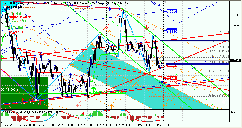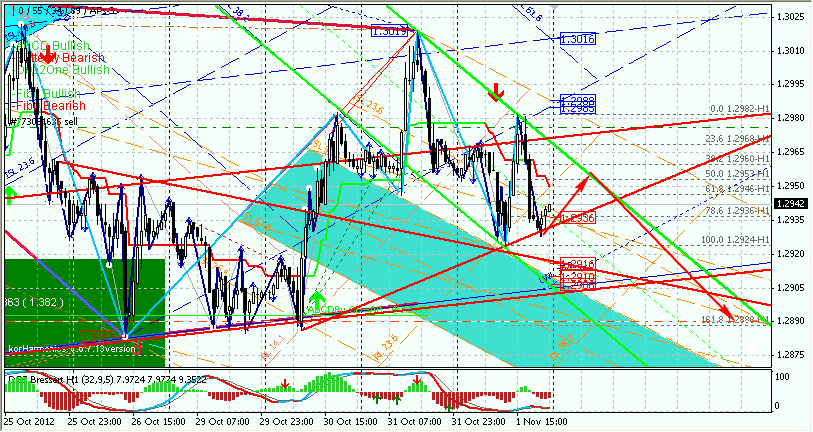 И... Что я могу сказать с не очень трезвого взгляда... Все равно на сегодня вниз. Можно конечно подрасти до1,2950+, но основное - вниз. Для меня первая цель - все тот же уровень 1,2990. Это фибо 161,8 + поддержка на дневках. Ясен пень (на скрине это видно) до этого уровня хватает поддержек, но, думаю, достанем.