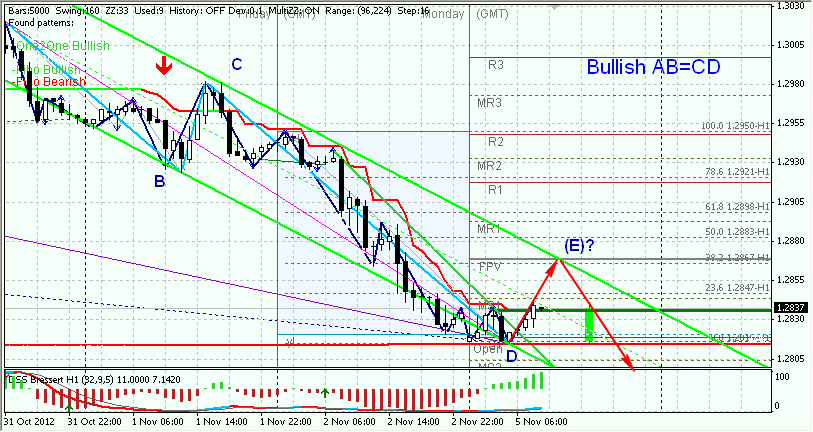 То, что азиаты не стали двигать цену - вполне естественно. То, что бычье коррекционное построение не порушили - хорошо. Могу предположить, что все пойдет по сценарию вчера нарисованному: 1) коррекция в зону между фибо 78,6 и 61,8 (1,2906 - 1,2922); 2) возврат к движению вниз с целью фибо 261,8 (1,2726). При этом коррекция может и раньше закончится. Все таки целую сессию цена в боковике.