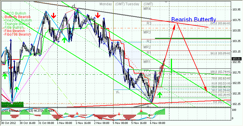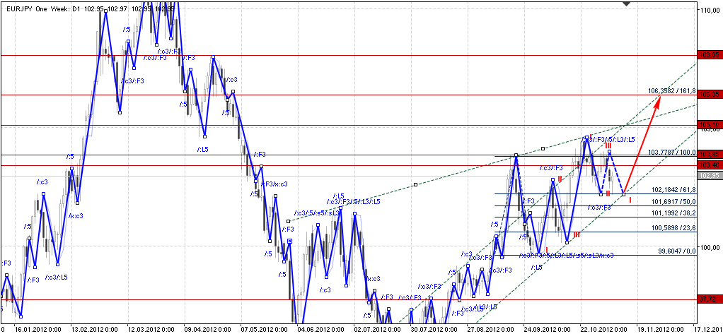 Я думаю, что с пробитием границы канала, цель переместилась на уровень фибо 261,8 (103,66). Дальнейший рост у меня вызывает сейчас сомнения. Во всяком случае, цена движется в сужающемся треугольнике и верхняя граница треугольника как раз будет тестироваться ценой в районе 103,66. Очень вероятен отбой вниз.