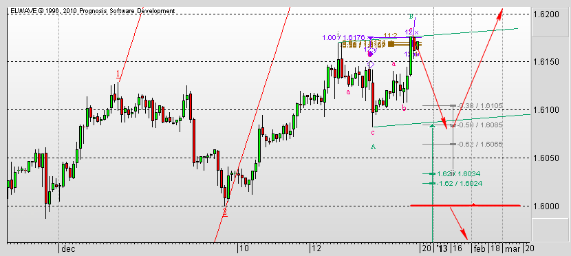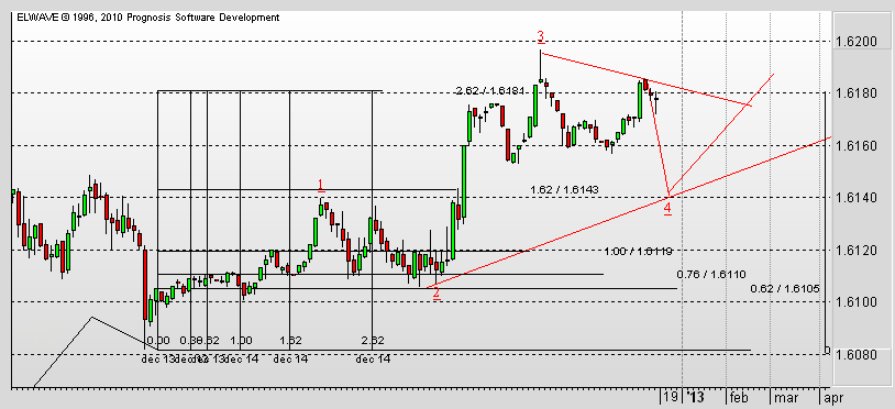 ![]() Есть вероятность того, что достигли целевого значения третьей волны. В таком случае предполагаю, что вероятна коррекция к уровням 1,6105 - 1,6065. Пробой уровня 1,6000 будет означать возврат к нисходящему движению.