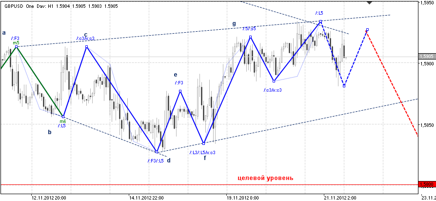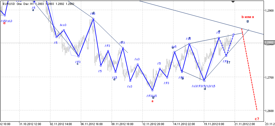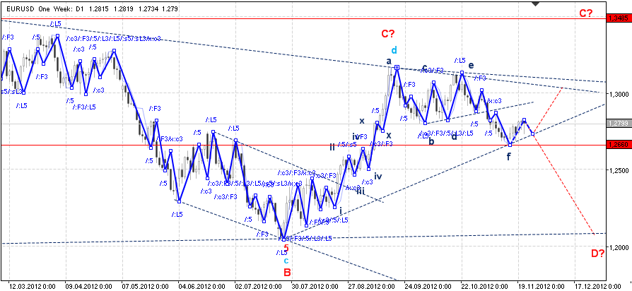 Таймфрейм Н1. Временной интервал D1 Двухэтапный процесс завершения фигуры диаметрика подтверждает актуальность текущего варианта. Является данная фигураb или х-волной пока Точно сказать сложно. Но все же предполагаю, что начала формироваться с-волна. Чтобы убрать из рассмотрения возможность развития х-волны цене необходимо преодолеть значимый уровень 1,2720, чтобы превысить барьер в 61,8% от восходящего движения, и в ценовом плане быть больше d-волны диаметрика. Как только цена преодолеет отметку 1,2720 критический уровень примет значение 1,2828. Целевой уровень в данной ситуации определяем соотношением 61,8% между волнами а и с, что соответствует уровню 1,2606. Хотя вариант разметки недельного графика предполагает цель 1,2550. Невыполнение некоторых правил в условиях завершения фигуры более высокого порядка можно считать явлением нормальным, поэтому если цена не сможет достичь отметки 1,2550 это не повлияет на общую волновую картину. Целевые уровни 1,2606; 1,2550.