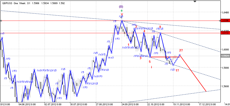 Таймфрейм D1. Временной интервал W1. В настоящий момент у нас имеется волновая структура снижения от уровня 1.6305. Структура имеет форму тройки. В данный момент идет формирование второй волны. Пока затруднительно идентифицировать данную развивающуюся модель. Но можно предположить, что после пробоя критического уровня, появится вероятность формирования третьей волны импульса. В рамках этого сценария, не исключено, что после локальной коррекции, которая не должна будет нарушить максимум второй волны старшего уровня 1.6178, снижение продолжится.