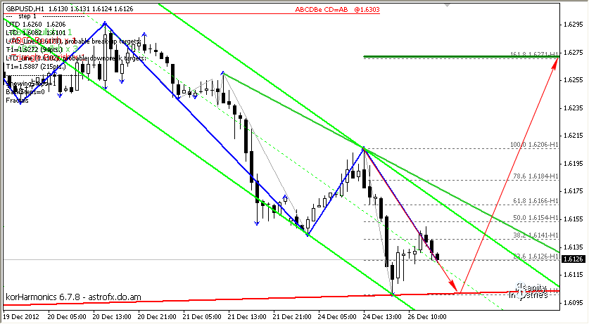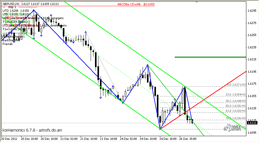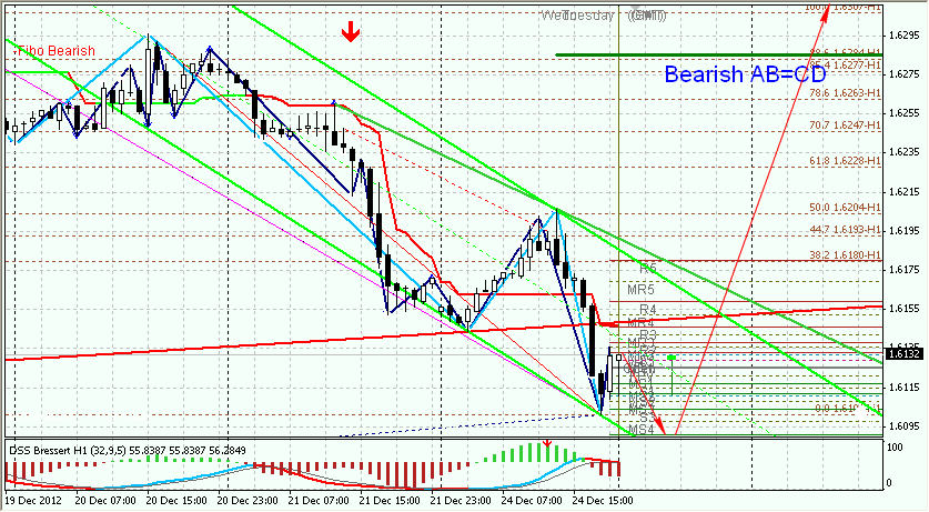 В данный момент на часах цена отбилась от верхней границы нисходящего канала и пробила восходящую локальную трендовую. Теперь можно рассчитывать на тестирование в самое ближайшее время уровня дневной поддржки 1,6090. Хотя, походу, куда нибудь к 1,6050 - 1,6040 сегодня может доползти.