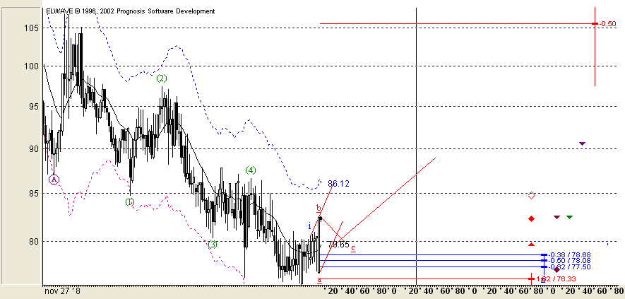 Можно предположить, что цена находится в процессе формирования (С)-волны. В этой волне вероятно формирование b-волны младшего порядка. Ее размер предположительно составит 38,2% от размера а-волны. Целевым же уровнем роста можно считать верхнюю границу канала - 86,12.
