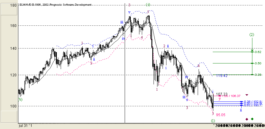 Есть такой вариант сценария. Предполагаю, что цена формирует i-волну. В соответствие с уровнями фибо ее цель может оказаться в диапазоне от 102,92 до 100,73. Критический уровень для нисходящего движения 119,42.