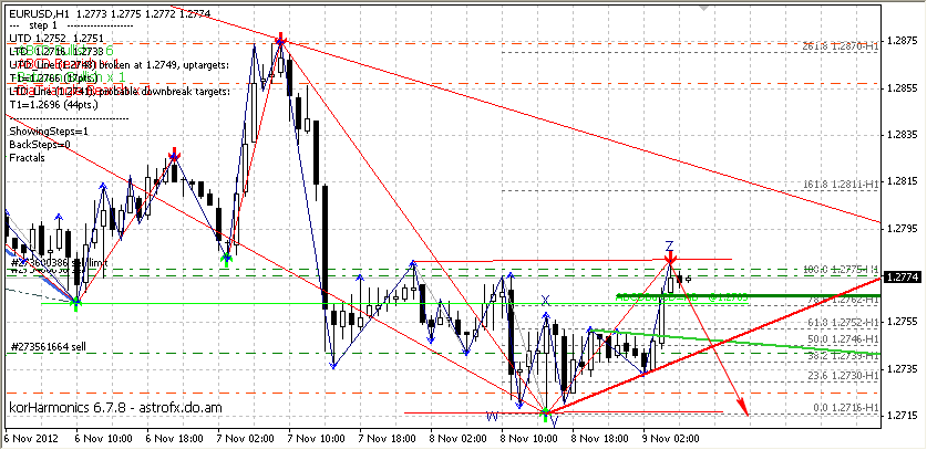 Как и положено, рынок ночью спит. Цена рисует коррекцию в виде троек в канале ограниченном уровнями 1,2781 - 1,2716. Предполагаю, что днем будет продолжено движение вниз к следующим целям: