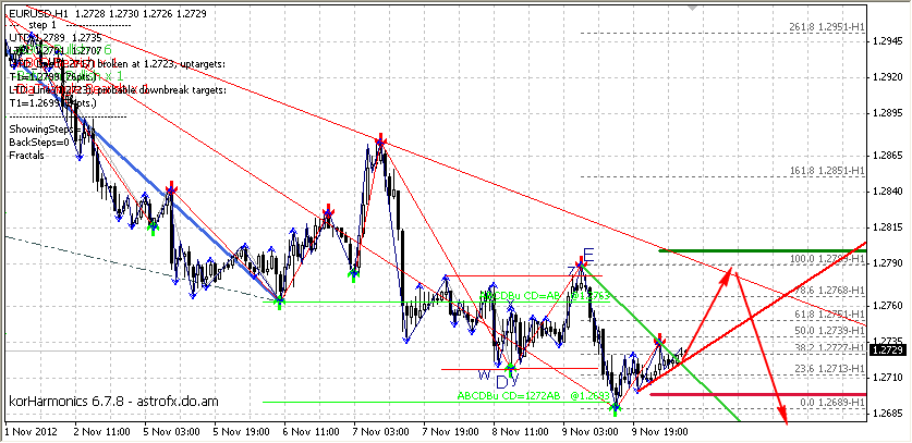 По евро баксу вроде как медвежий тренд. Я так думаю, предпочтительно и торговать на понижение. Но если быки закрепятся выше уровня сопротивления +/- 1,2725, тогда , наверное, все таки выйти из рынка и на забор. Смену тренда будет предвещать пробой уровня сопротивления +/- 1,2788...