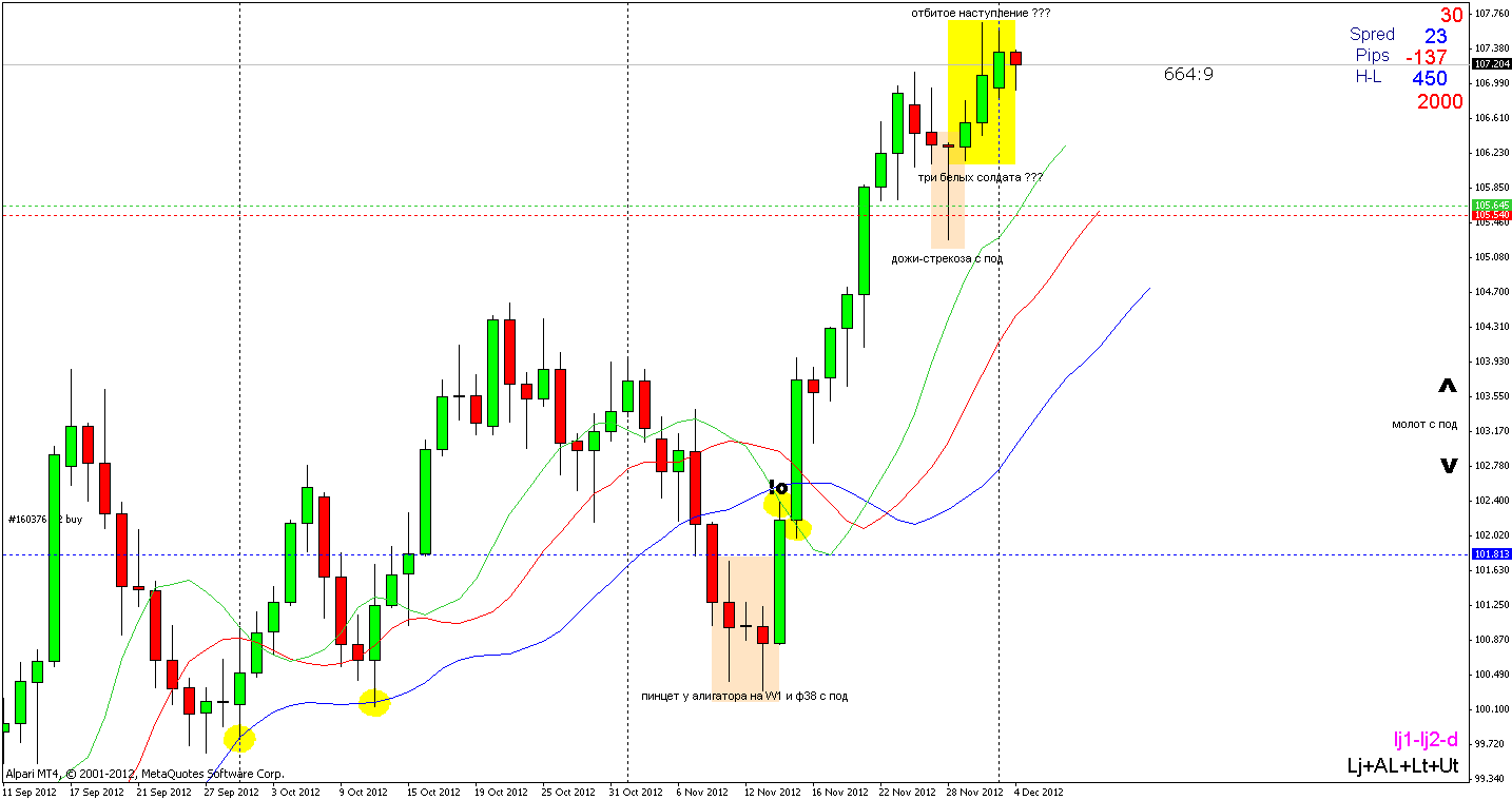 Но, последние три свечки выглядят весьма подозрительно - они могут оказаться как сигналом к продолжению роста, то есть "Три белых солдата" так и медвежим сигналом "Отбитое наступление" поэтому подождем до вечера и если медвежий сигнал получит подтверждение то бай ордер я закрою и на время понаблюдаю со стороны, в противном случае лонг еще попридержу, зачем препятствовать росту профита -) Д1