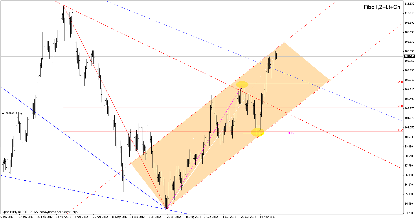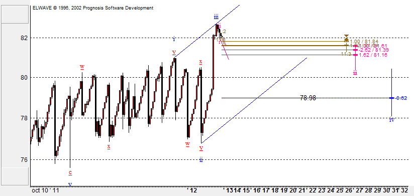 Если рассматривать волновую структуру движения цены, можно предположить, что своих целей восходящее движение уже достигло. Остается вероятность того, что волна w сможет достигнуть уровня 111,60, тогда это будет просто сильнейший сигнал на продажу. Пока же можно предполагать движение к уровням 107,00 и 105,83.