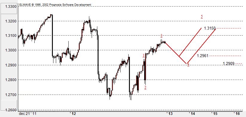 Есть вероятность того, что завершается третья волна в первой волне С зигзага старшего уровня. Если предположение верно, то в ближайшее время нас ожидает коррекционное снижение в 4й волне к коррекционным уровням 24% - 38% (1.2960 - 1.2910), с последующим ростом в пятой волне к целевому уровню 1.31. Но, нельзя исключать и удлинения в пятой волне в третьей. В этом случае рост будет продолжаться без существенных коррекций к расчетному уровню 1.3150.