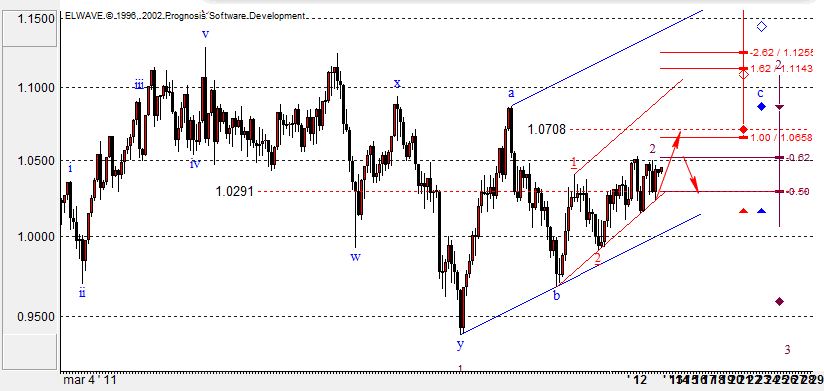 Наиболее вероятным видится продолжение движения цены вверх к цели 1,0708 в процессе формирования третьей волны. Но в структуре этого движения по прежнему остается возможность коррекции к уровню 1,0290. Это видится те более актуальным, что формирующаяся вторая волна глобального нисходящего движения достигла своего минимального целевого уровня.