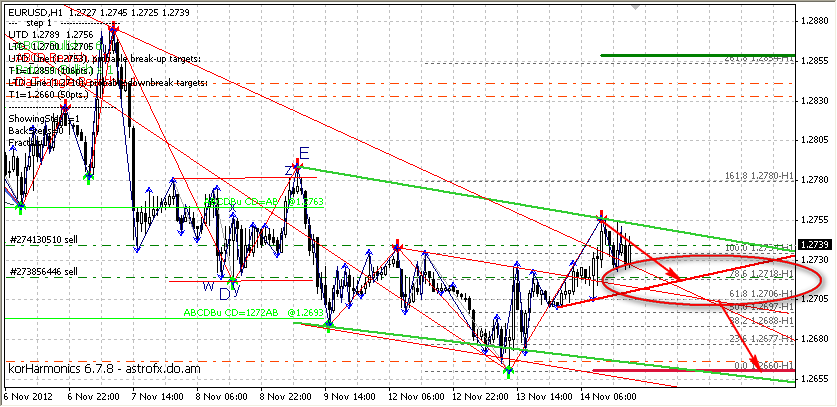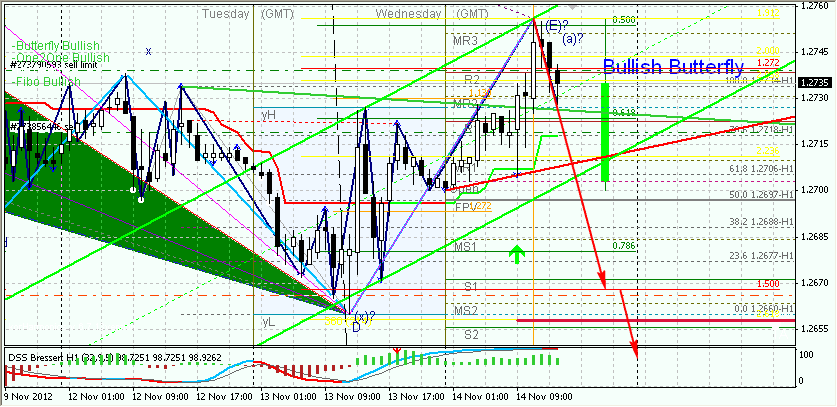 Что имеем? Имеем сформировавшийся локальный канал движения. Канал был расширен после пробоя уровня сопротивления 1,2718 (уровень фибо 78,6). Дальше - возврат в зону ограниченную уровнями фибо 78,6 (1,2718) и фибо 61,8 (1,2706). Пробитие последнего уровня ведет к возврату к последнему лоу1,2660.