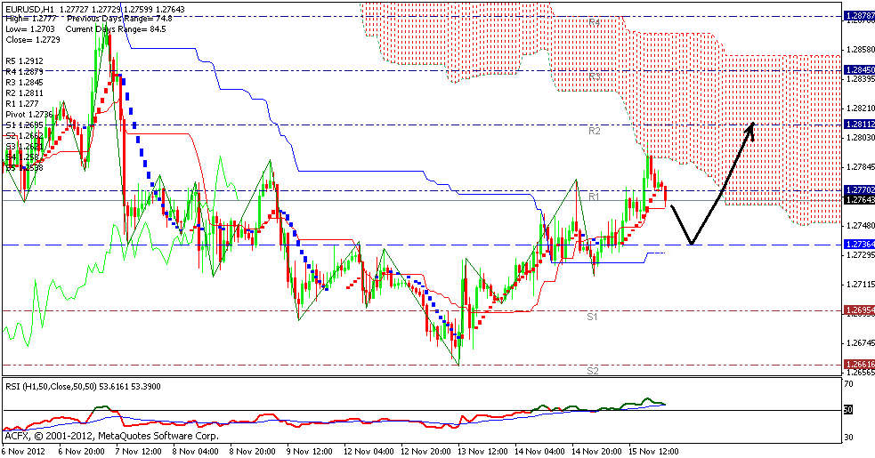 на часовике пара подошла к границе облака и отбилась от него, коррекционное движение дошло до линии тенкана 1.2760 но может продолжится и до кинжута 1.2735 . На завтра необходимо пробивать облако и закрепляться в нём, а все остальное же доработаем на следующей неделе. Если все пройдет нормально, то перспективы роста до 29 фигуры сохранены.