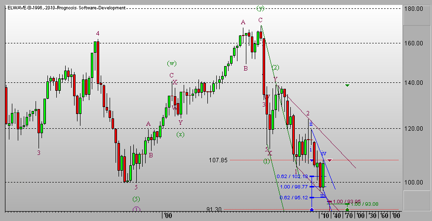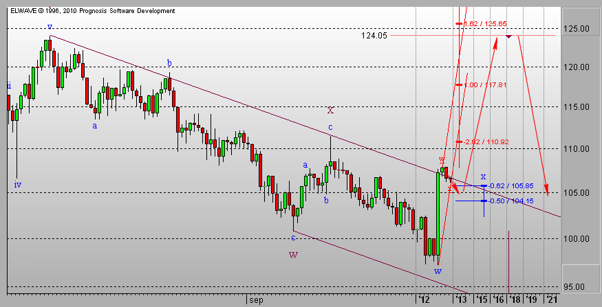 Можно предположить такой сценарий, при котором имеем возможность начать формирование третьей волны в С-волне. нисходящего импульса. Если это предположение верно, тогда целевым уровнем становится значение 91,30. Ближайшие цели при такой разметке - это цели волны iv: 102,19; 98,77; 95,12. ![]() Альтернативные варианты. Есть вариант, при котором может движение вверх продолжится (формирование у-волны). В таком случае рост может достичь уровня 107,25. Но в краткосрочной перспективе актуальными становятся продажи с целями, соответственно: - для у-волны 106,34; - для второй волны (или четвертой волны старшей структуры) 105,88. ![]() Если предположить, что произошел пробой нисходящего канала, то появляется возможность движения к уровням вплоть до значения 125,65. Но в любом случае, из-за наличия негативных сигналов, актуальными остаются цели Х-волны на уровнях 105,85 - 104,15.