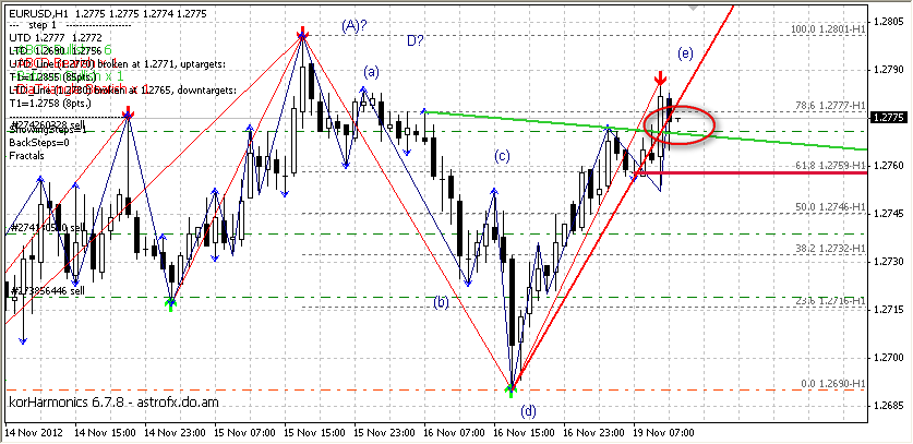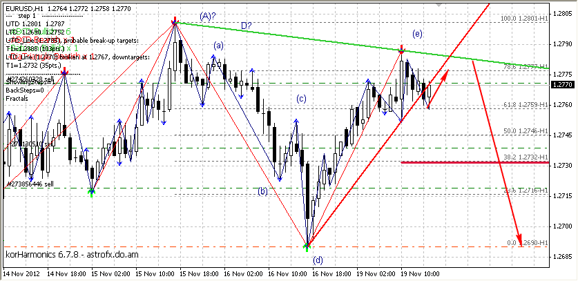 На часе,по евро четко видно ,что идем к уровню наклонного канала и к пивоту на часе.Тоесть во всяком случаи мы доковыляем до 1.2705,а воттам уже нужно будет смотреть,так-как оттуда возможна,как и первая волна вверх,так и продолжение цикла вниз.