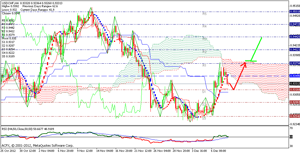 Цена с корректировалась вверх к границы облака и отскочила от неё.При этом тенкан пробила кинжут снизу вверх и выравнялись в горизонтальном направлении. Котировка может опуститься на данные линии в район 0.9315-10. Далее ожидаю восстановление восходящей тенденции с пробоем зоны неопределенности и ростом к верхней границы 0.9375. Пробой облака будет способствовать импульсному росту в район 0.9440.