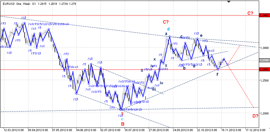 волна А прошла на 38% коррекции к движению от 5 волновки, волна В прошла на 50% от волны А - теперь строим С от 1,2660. график ранний - новый рисовать в лом - разницы нет никакой - разве что на текущих виклях вторая бычья неделя уже пошла... цели по волне С на 261% от волны В и на уровне 61% от общего снижения 5 волновки (почти совпадают)