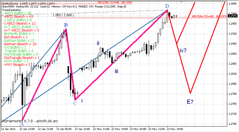 1. Откат. Цена может достичь уровней в районе 1,2750 - 1,2780. И об этом говорит вероятность того, что начинается формирование D-волны. Но снижение может закончиться и в диапазоне 1,2909 - 1,2900, т.е. отмотав всего 38,2% - 50% от последнего движения. 2. Очень вероятен возврат к росту.