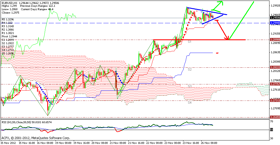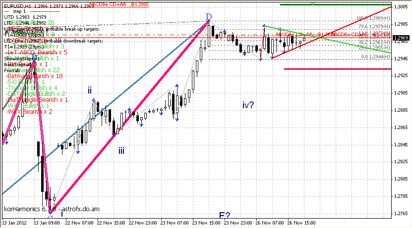 Ну, выйти-то из треугольника вышли. И вышли в требующемся направлении. Только выход получился неуверенный. Как бы сейчас не вернуться в обратный зад. Тогда получим просто изумительный флэт в диапазоне 1,2955 - 1,2980 до завтрашнего дня.