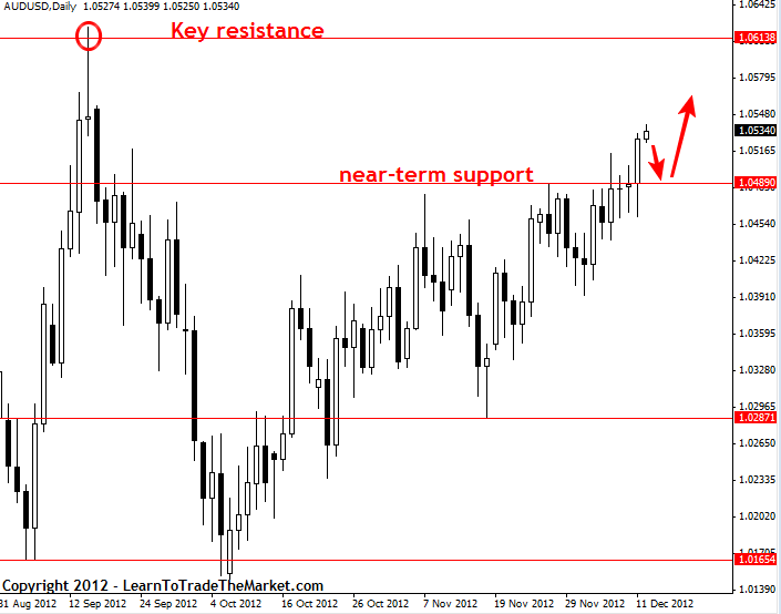 По австралийскому доллару дела обстоят иначе. Цена уже несколько дней подряд набирает обороты для роста, но я сейчас жду отката до ближайшего уровня поддержки в районе 1.0489, думаю, что пробоя не будет и цена дальше уйдет в рост, к дальнейшему уровню сопротивления в районе [font=Calibri, 'Helvetica Neue', Helvetica, Arial, Verdana, sans-serif]1.0612. Пока входить в рынок не советую[/font]