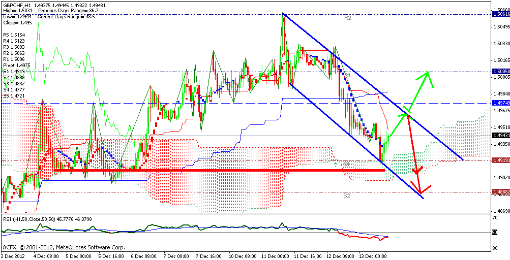 Тенкан пробил кинжут сверху вниз, что указывает на перобладание нисходящей тенденции, но в тоже время РСИ сигналит о пере проданности пары и цена протестировав границу облака отскочила от неё. Основным движением рассматриваю коррекционный откат вверх на уровень 1.4975 и возможным проколом до 1.50. Но всё же далее цена снова может продолжить падение после пробоя облака котировка может упасть на 48 фигуру. Сопротивление - 1.4975, 1.5006, 1.5062 Поддержка - 1.4919, 1.4888, 1.4832