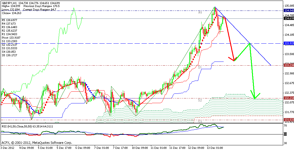Пара хоть и торгуется выше тенкана и кинжута, но всё же на РСИ можно рассмотреть признаки формирования коррекционного отката. В случае отскока от трендовой и пробой тенкана предположения перерастут в реальный сигнал с ТП на кинжуте 133.35, но не исключаю снижение в район 132.20 Сопротивление - 134.94, 135.62, 136.65 Поддержка - 133.92, 133.24, 132.21