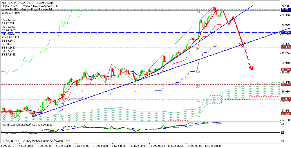 Основным прогнозом рассматриваю всё же коррекционное движение вниз.Основная линия РСИ пересекла сверху вниз сигнальную и снова тестирует её снизу. Цена тестирует сопротивление 70.52 и думаю пробоя не будет.Тенкан и кинжут идут горизонтально. Более уверенно можно говорить о коррекционном снижении после пробоя тенкана 70.08. ТП рассматриваю на 68.71.При пробое уровня 70.52 нас ожидает уровень 71 фигуры.Лучше всего на откатах искать точки входа и против тренда не работать. Сопротивление - 70.96,71.65, 72.33 Поддержка - 69.84, 69.40, 68.71