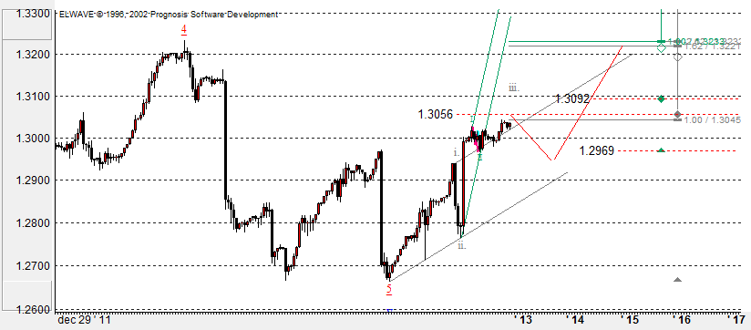 Опять же, касаясь структуры движения, можно предполагать, что пока цена формирует (или уже сформировала) волну iii импульса. Среднее возможное значение ее ценового предела как раз составляет около 1,3056. Возможен откат в виде волны iv. Полагаю, стоит искать возможность для входа в покупки от уровня 1,2969 - 1,2985.