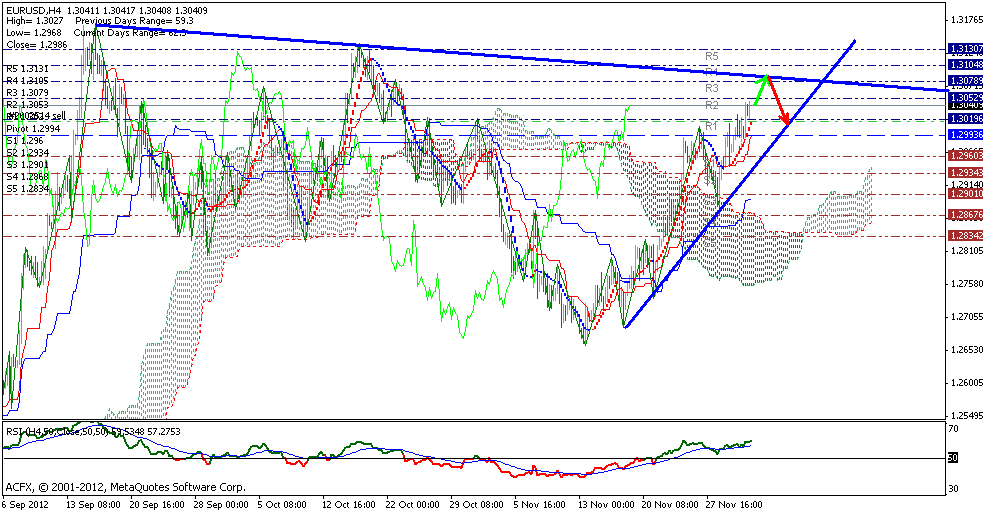 никаких препятствий для роста на 4 часовом графике не видно, по крайней мере до уровня 1.3080, но и покупать на перекупленном рынке как то уже не хочется. Основной тенденцией буду рассматривать продажи от уровня 1.3080 с первоначальным ТП на уровне 1.3020.В настоящий момент пара торгуется выше тенкана и кинжута и над облаком, что подтверждает восходящую тенденцию, ждем касания первого сопротивления на 1.3080.