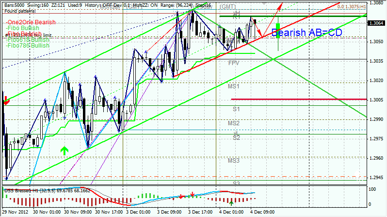Быки вроде как закрепились выше уровня сопротивления +/- 1,3062, который теперь сильный уровень поддержки. Я так думаю, что и дальше стоит торговать на повышение. вот еще поставил на график трендовую линию, которую, как минимум, нужно пройти медведям, что бы можно было задумываться о продажах. Я так думаю, что вот вот стрельним на север к сопротивлению +/- 1,3127, но не факт конечно, посмотрим: