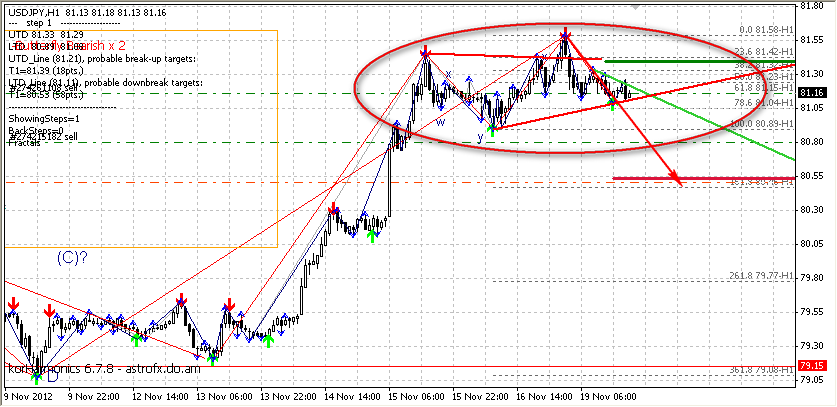 По данной валютной паре цена, я так понял находится во флэте и данный флэт расположен внутри сильной бычьей свечки, которая сформировалась немногим ранее. Это дает предположение, что на текущий момент формируется фигура продолжения тенденции и по идее полет на север продолжится , но не факт конечно, посмотрим...имхо