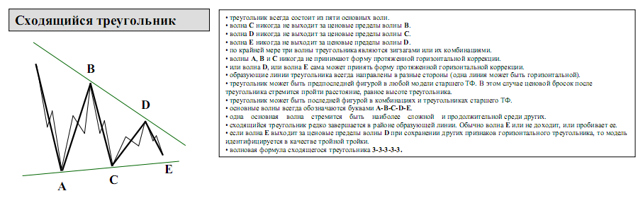 1)в основном лежащие стороной на трендовой линии, внизу или наверху тренда, 2) треугольник отрабатывает только пройдя минимум 2/3 своей длинны 3) должно быть 5 точек не выходя за пределы треугольника Но это лиш мое ИМХО |