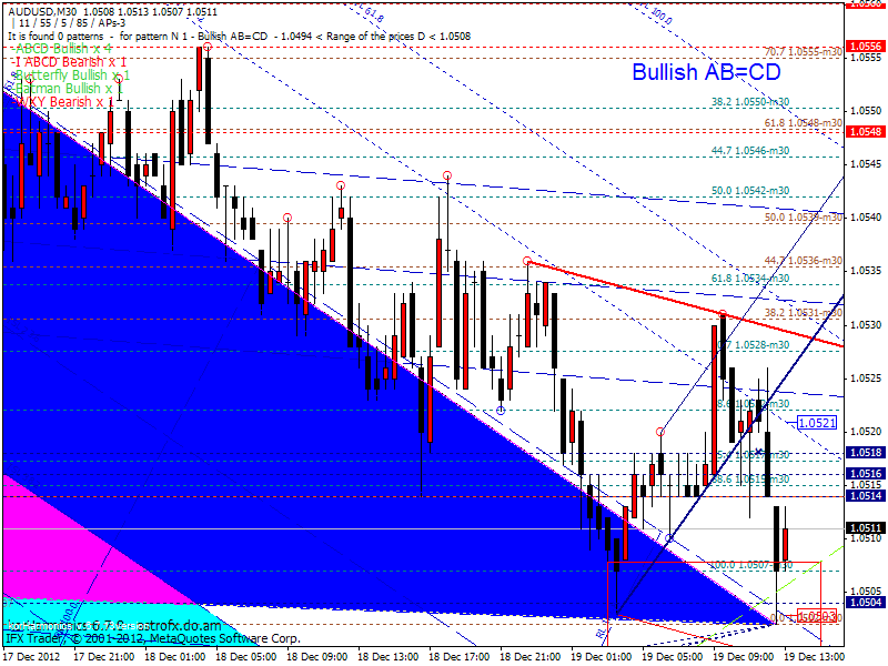 audusd. Предположительно, что пара может откорректироваться к уровню 1,0531-1,0548. На М30 есть бычий паттерн по ЗУП, а на М15 двойной сигнал и по ЗУП и по Гармонике. Но что-то не очень хочется в рынок входить.