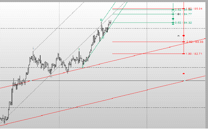 usdjpy. Ситуация на часовике спорная. Наблюдаем восходящие вилы Эндрюса, но и имеем медвежий паттерн, который не отработал как я считаю. Что самое интересное, так это то, что цена остается в пределах "мирор-тренд" и отбрасывать возможное снижение к уровням 84,10-05 нельзя.
