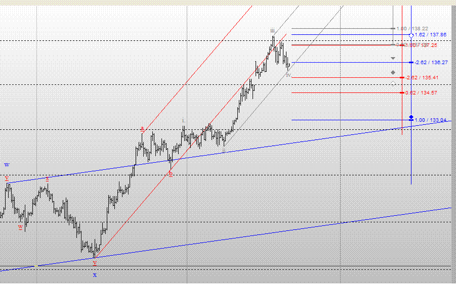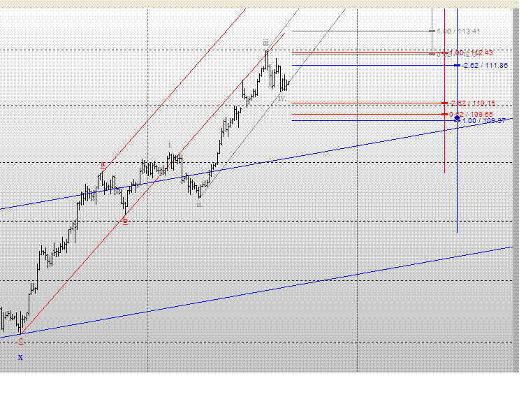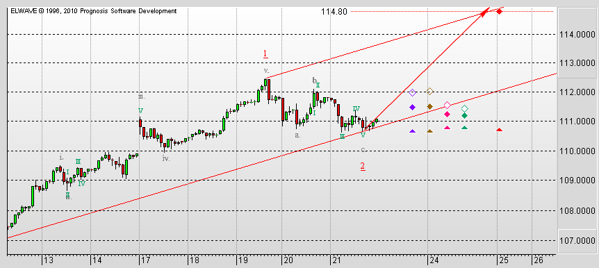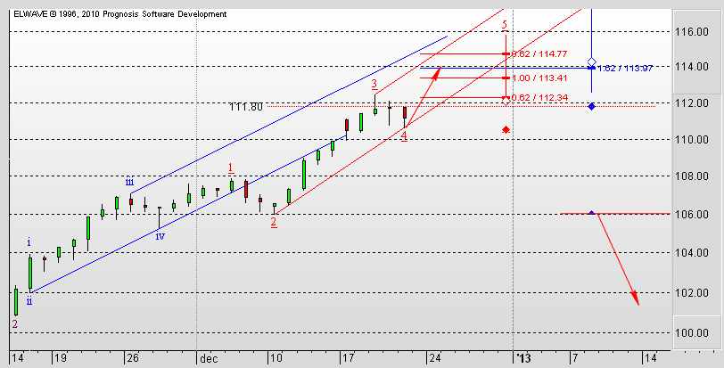 Рассматривая дневной график можно предположить, что сейчас идет формирование пятой волны в пятой. Если это предположение верно, то можно рассчитывать на тестирование уровня 113,97 (минимальная цель волны старшей степени). Критическим уровнем для восходящего движения можно считать уровень 106,00.