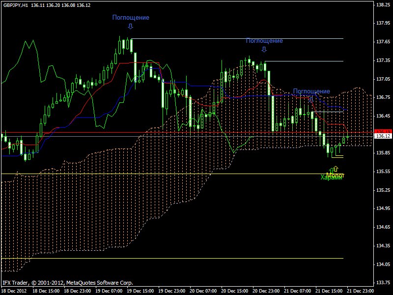 ![]() gbpjpy. Если рассматривать ситуацию по Эллиоту на часовике. Видим, что закончилось формирование четвертой волны и получается, что цели отработки пятой волны находятся примерно на уровне 138,22, возможно даже около 139,69 ![]() gbpjpy. А вот по ишимоку (12,"4,120) прямо таки кричит, хочу на север. Видим, что пара пробила Сенкоу Б и образовала сразу две бычьи формации "харами" и "молот" и уже прибилизилась цена к Тенкан. Надеюсь, что в понедельник энтузиазм не утихнет.