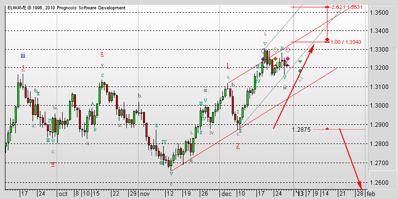 И в продолжение вернусь к теме волнового анализа на графике ТФ Н1. На скрине видно, что снижение - это вторая волна восходящего импульа младшей степени. И по прежнему идет формироване третьей волны в третьей. И по прежнему минимальная цель третьей волны старшей степени - уровень 1,3343 (100% протяженности волны 1).