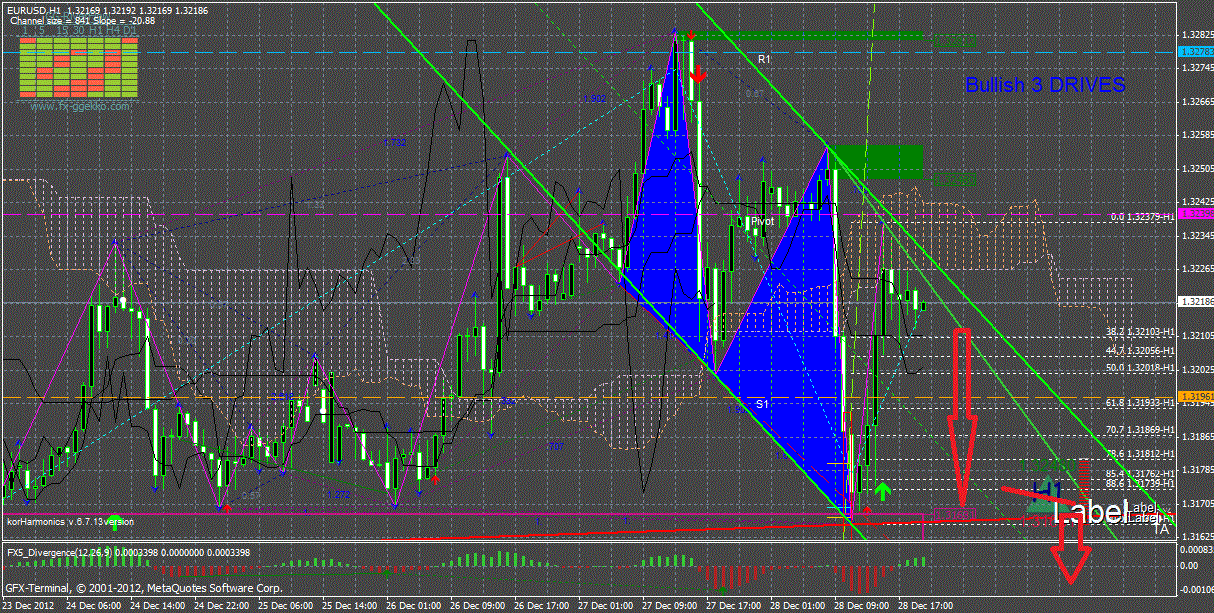 Кстати ,вот так красивее получится опять же) снижение к трендовой и по каналу ,вход цены в треугольник и с последующим выходом вниз к уровню,примерно 1.3155 к пивоту ,а там и во флет,цена уже бьется 5 часов и ни как не может вверх пробиться ,может облако мешает,но явно сильный уровень,в таком случае по идее должен быть возврат к последнему лоу в моем понимании.