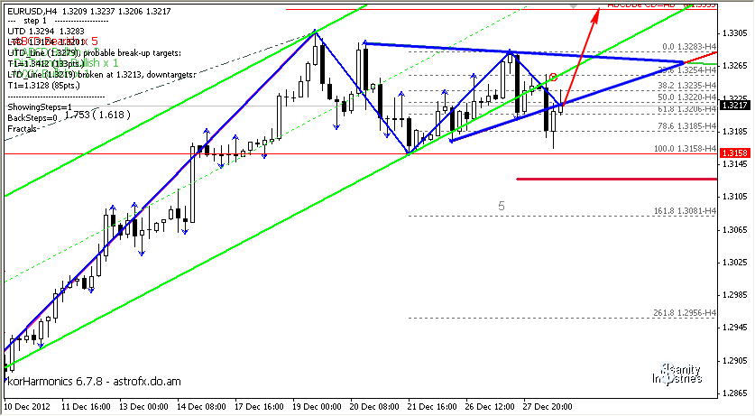 Про график ТФ Н1 писал в начале дня (до выступления с бенефисом на ГНТС). К нему -чуть позже. Для начала график ТФ Н4. Имеем бычье движение и медвежью гармонику. При этом пробили локальную трендовую вниз. Кстати, оттолкнулись от того уровня, на который рассчитывал в пятницу/понедельник. Теперь, возврат в выделенный треугольник будет означать вероятность его пробития вверх. В таком случае целью будет являться уровень в районе 1,34. При этом с уровня 1,3335 начнет формироваться медвежья гармоника. Я как-то отмечал, что по ВА целью является уровнь 1,3343. Поэтому и буду туда целиться.