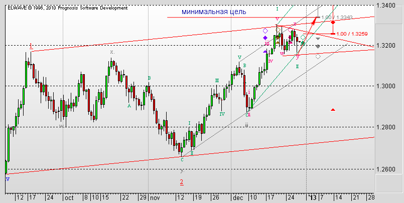 ТФ D1. Имеем продолжение в виде третьей волны восходящего импульса, начавшегося формироваться в начале декабря. Есть вероятность, что двойной зигзаг, который является коррекцией, закончил свое формирование. По большому счету, даже если он превратится в тройной зигзаг, это для продолжения тренда не будет иметь решающего значения. Минимальный целевой уровень отмеченноы выше третьей волны находится на уровне 1,3343 и находится внутри диапазона, ограниченного целями третьей волны старшей степени. В случае растяжения волна может продолжится к уровню 1,3643.