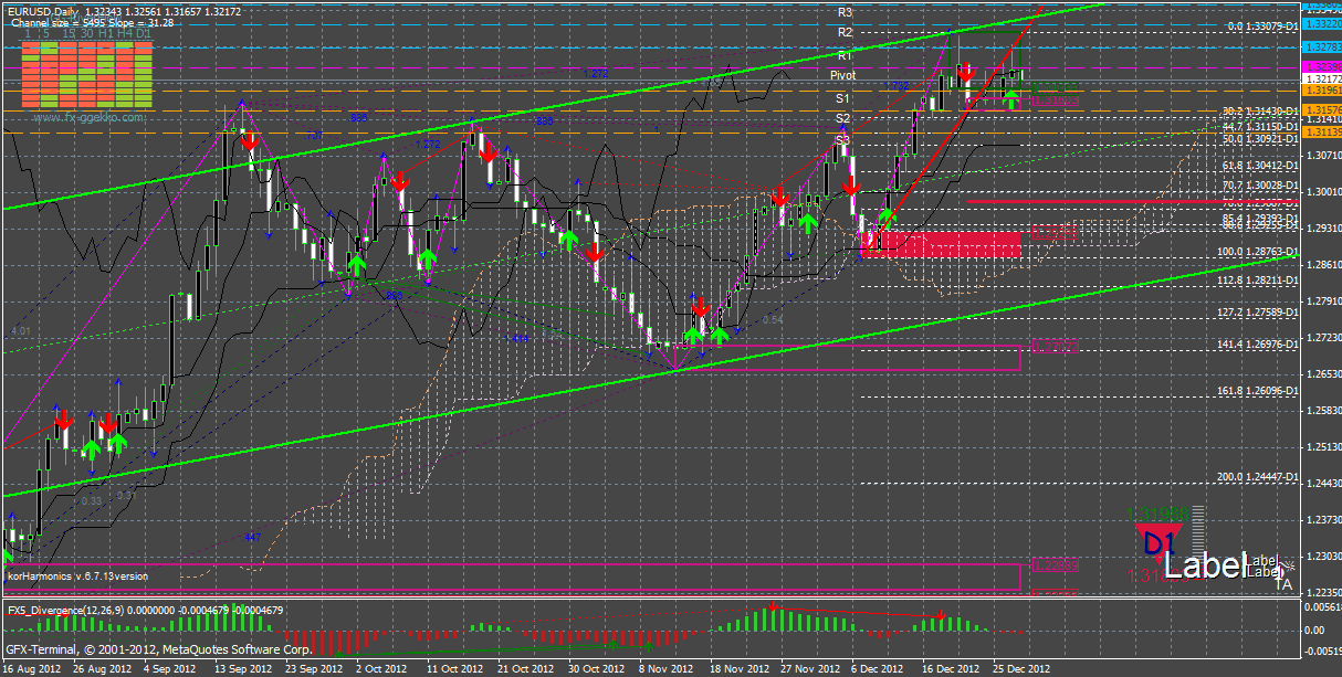 Годится. Давай посмотрим тогда такой вариант. Я уж на твоем скрине, чтобы не уходит от темы. Цена достигает облака. Естественно - сильное сопротивление. Отбивается. Как уровень для локальной коррекции берем уровень фибо 38,2 (1,3210). Дальше как раз появляется возможность пробить облако.