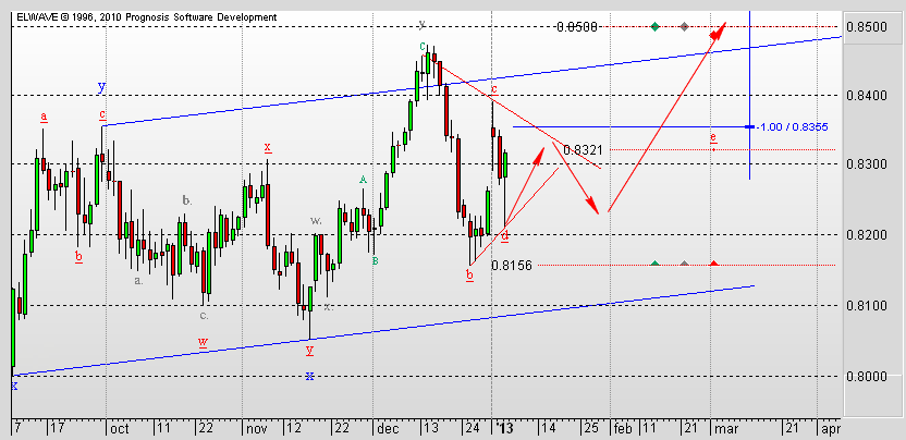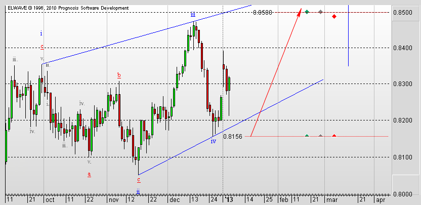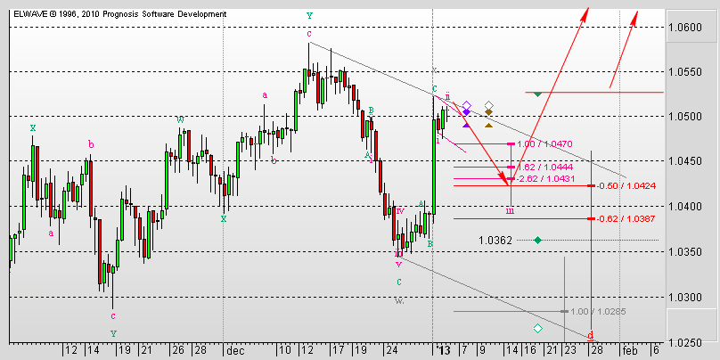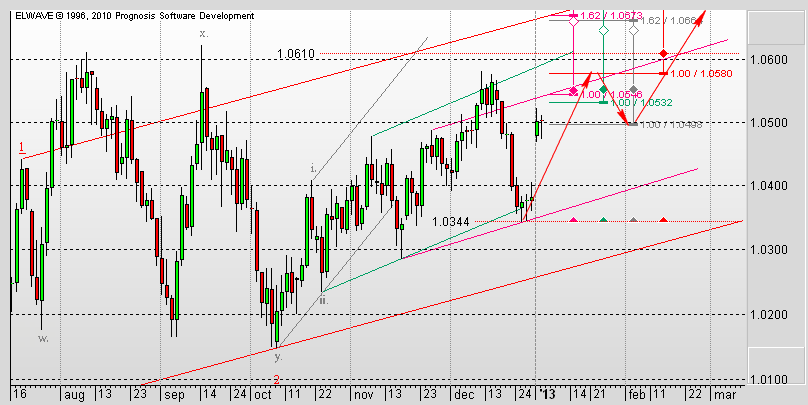 Если считать приведенную ниже разметку верной, то продолжается формирование третьей в третьей. В таком случае получается, что минимальный целевой уровень этой волны - уровень 1,0580 (100% величины первой волны старшего разряда). Пр этом есть вероятность развития зигзага к уровню 1,0850. ![]() В качестве альтернативного варианта можно рассматривать возможность коррекции в виде третьей волны младшего разряда в Y-волне.