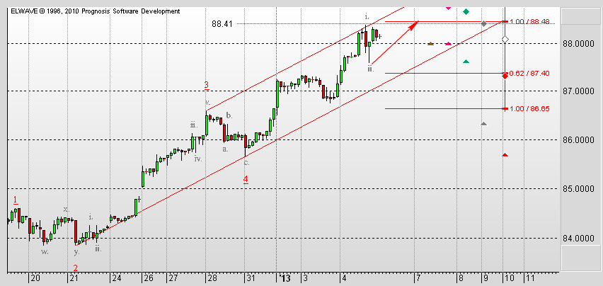 Посмотрим, что делается с волнами младших разрядов. И тут, если приведенная разметка верна, то можно предположить, что заканчивается формирование пятой волны. Ее целевым уровне, по всей вероятности, является уровень 88,48, что в принципе ненамного отличается от целей разметки волн старшего разряда.