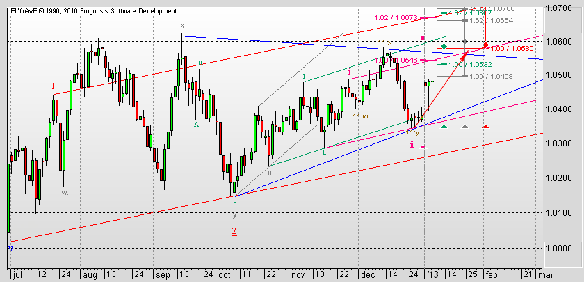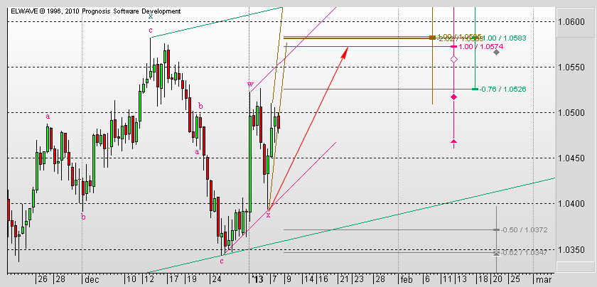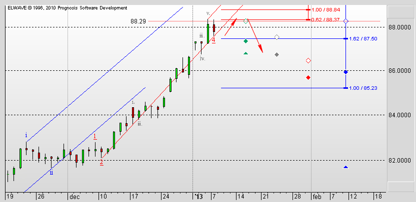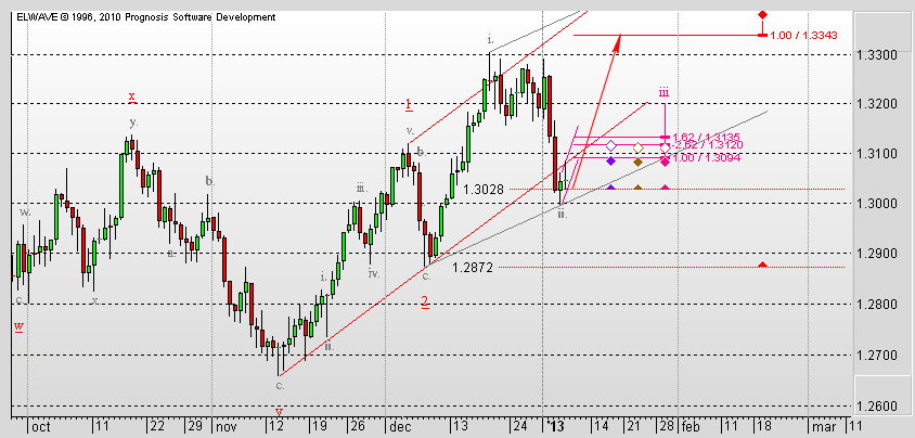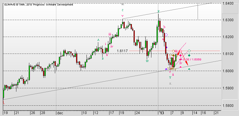 И тут уж как ни смотри, а назревает откат, как минимум, если не коррекция. Можно предположить возможность такого сценария. Заканчивается формирование третьей волны во второй коррекционной волне восходящего импульса. Она еще может достигнуть уровня 1,6117, после чего можно ожидать коррекцию к уровню 1,6089.