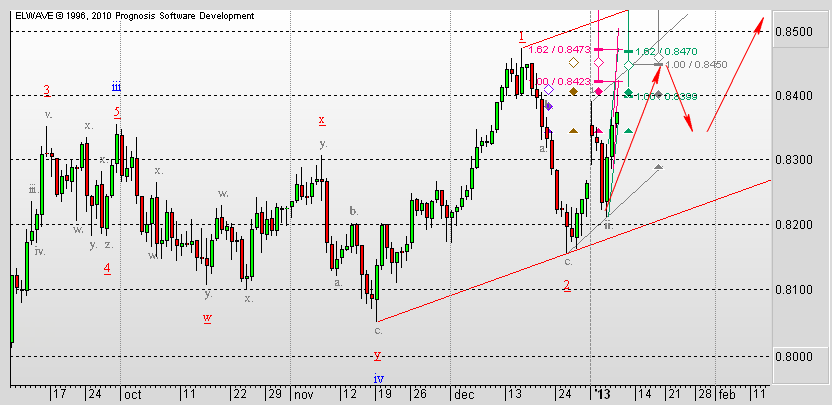 Имеем сходящийся треугольник. Выход из треугольника представляется в виде третьей волны в третьей восходящего импульса. В этом случае можно рассматривать в качестве ближайшей цели уровень 1,0580 (минимальная цель волны старшего разряда. Максимальная цель роста представляется на уровне 1,0937. ![]() . |